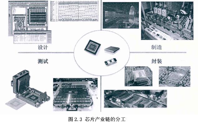 LED顯示屏芯片制造業(yè)屬于高風險高投入高收益的“三高”行業(yè)。入行門檻較高,但隨,著國家對集成電路行業(yè)的大力投入和支持,許多芯片設計公司紛紛成立,其根本的生命力在于它可以大批量、低成本和高可靠地生產。比如,集成電路芯片的價格約為10-100美元,而生產線的投資卻高達10-15億美元(200mm,0.1 8um),隨著工藝不斷向著深亞微米級發(fā)展,目前已有28nm的生產工藝,投資會越來越高。為了滿足市場的發(fā)展需要及降低芯片的生產成本,如圖2.3所示,市場上出現了芯片制造產業(yè)鏈的分工,主要包括設計、制造、封裝和測試四大部分。